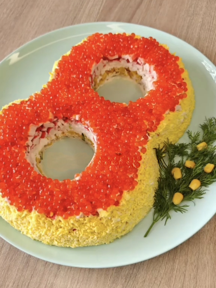 Перед подачей дайте салату настояться в холодильнике на 1-2 часа. Так он станет ещё более вкусным и красивым. С таким крабовым деликатесом 8 Марта станет действительно незабываемым!